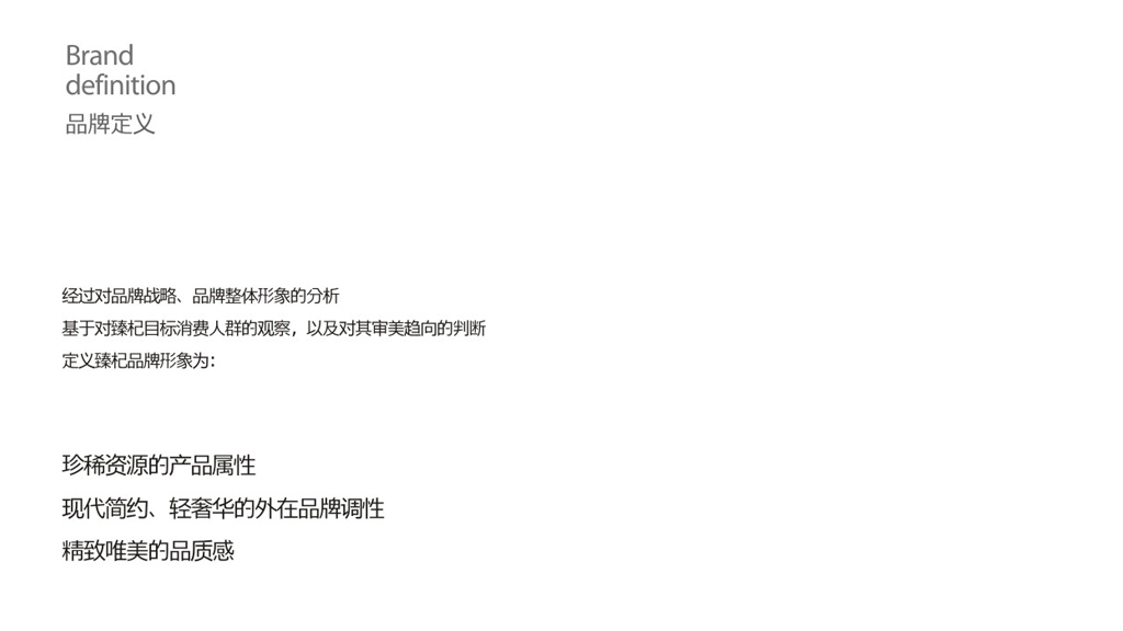 智圓行方團隊經過對品牌戰略、品牌整體形象分析,基于對臻杞目標人群的觀察,以及對其審美趨向的判斷,定義臻杞品牌形象為:珍稀資源的產品屬性現代簡約、輕奢的外在品牌調性精致唯美的品質感。