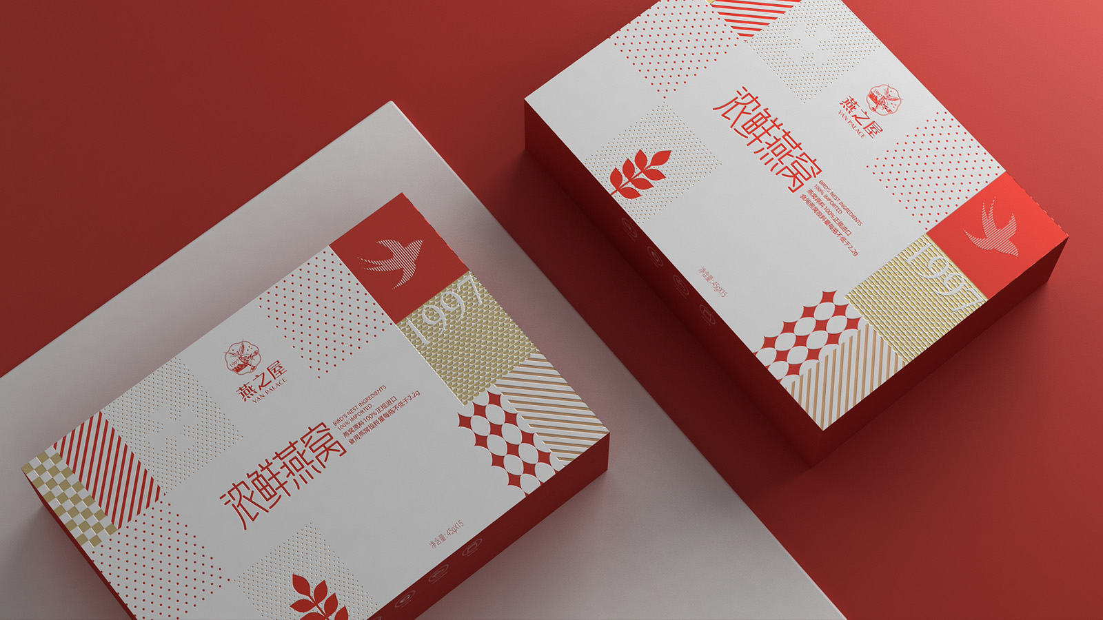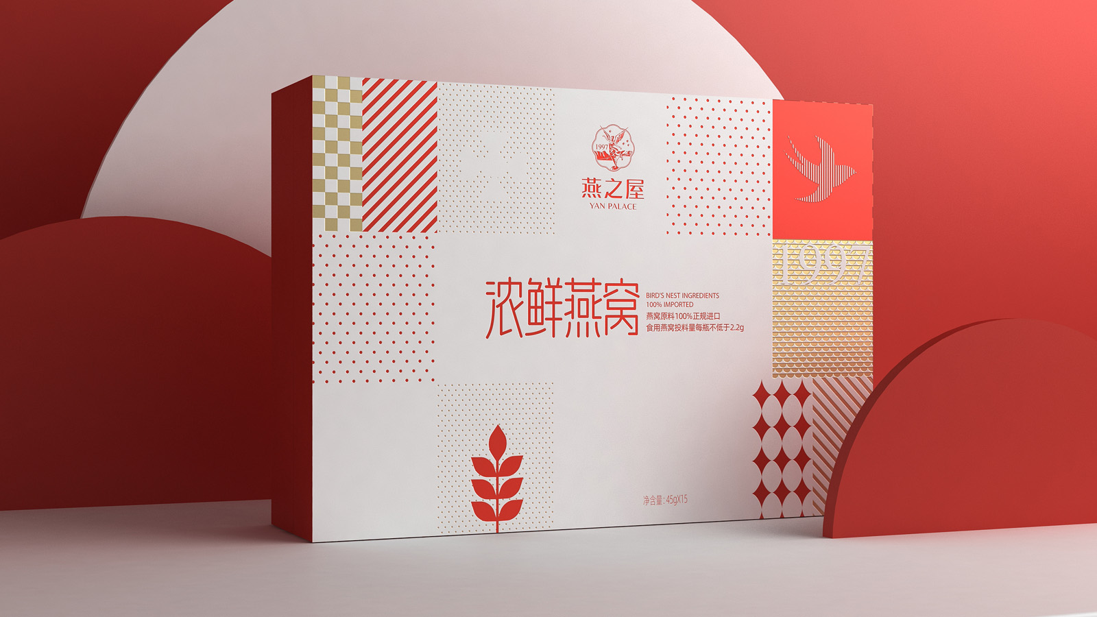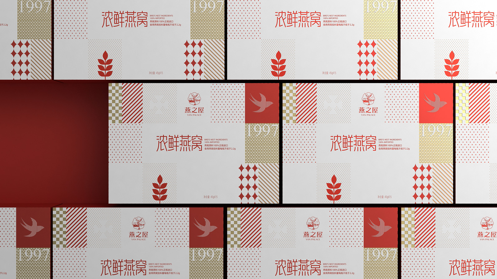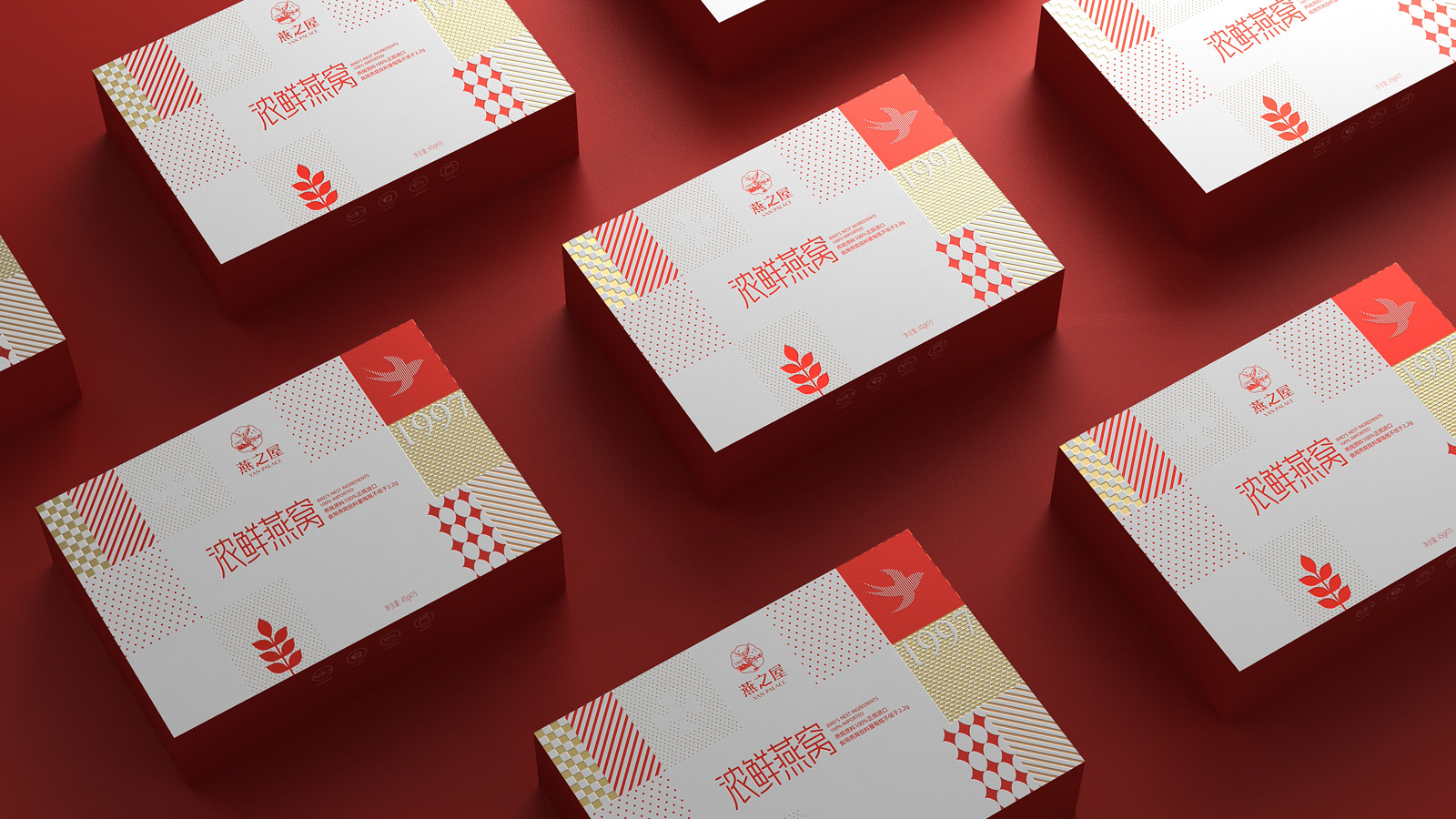 畫面的中的燕子代表著產品屬性,1997是燕之屋的成立時間,表達了燕之屋在燕窩領域行業已經深耕了23年,經典的波點,方格是對燕之屋的印象具象化表現,主要是為了烘托氛圍感,葉子代表著無添加,純天然,表達了燕之屋用心做產品的匠心精神。