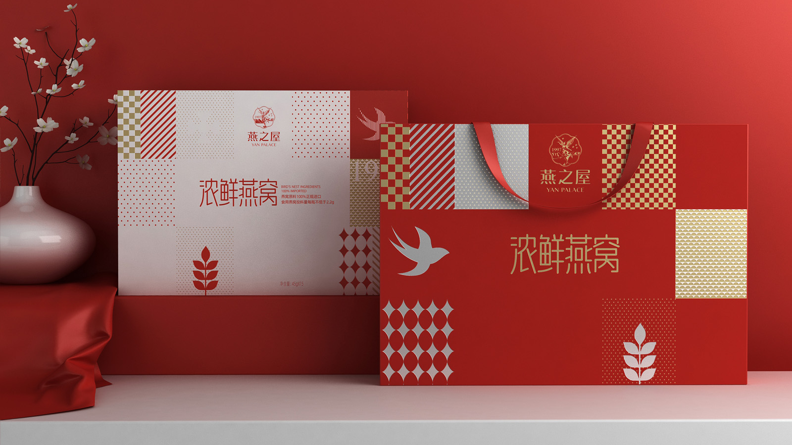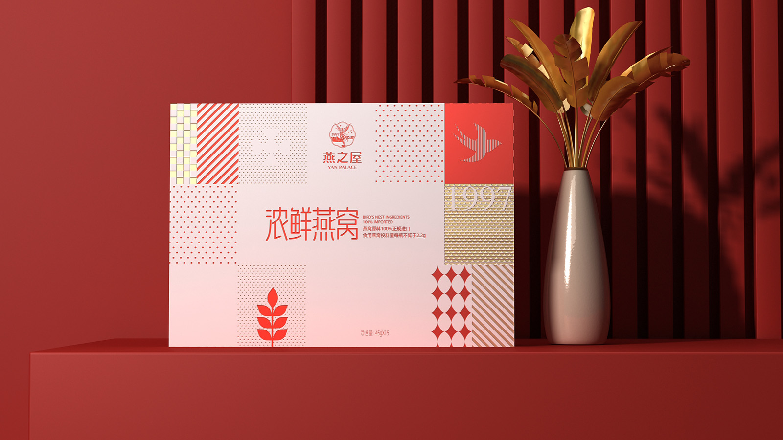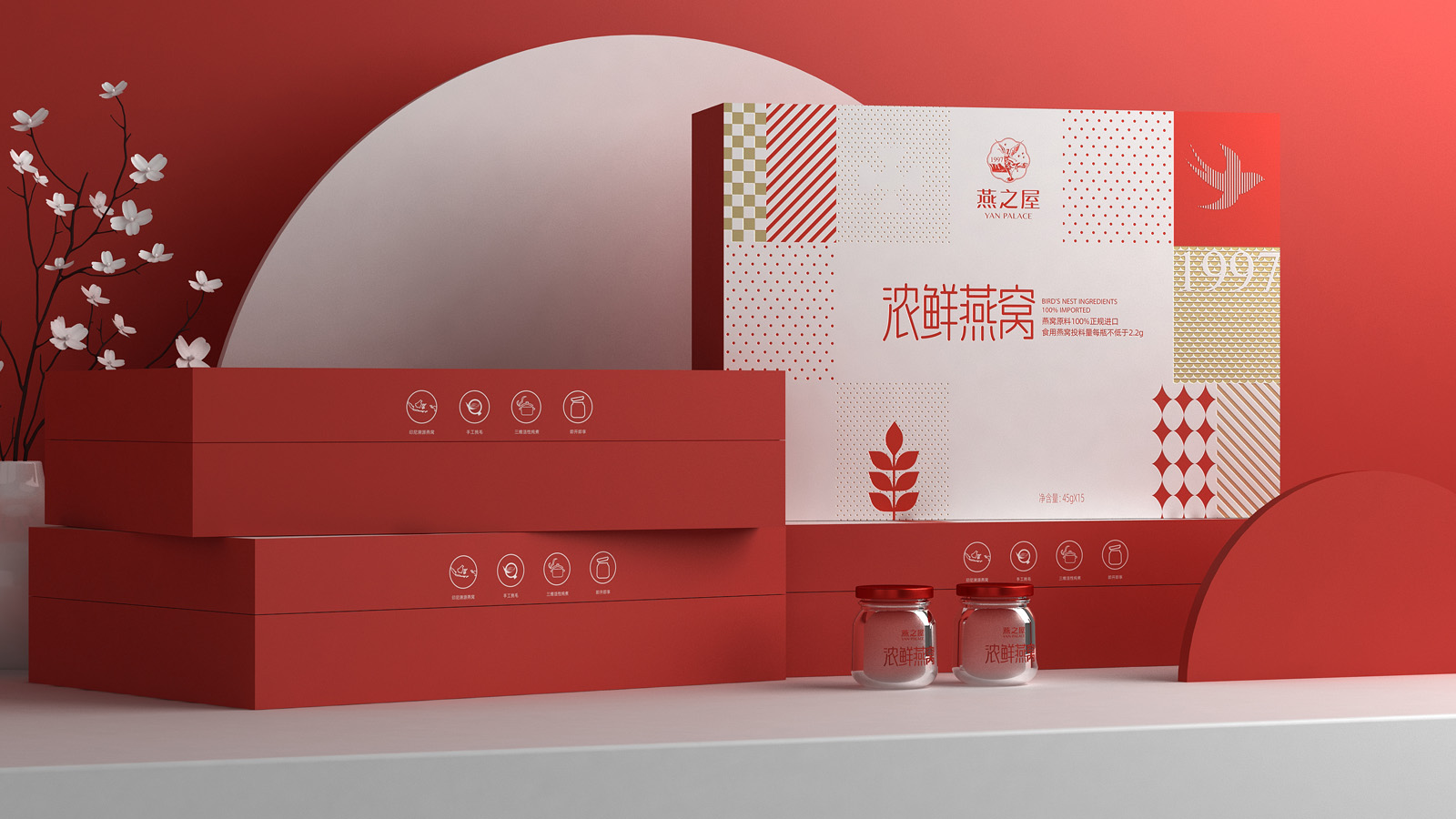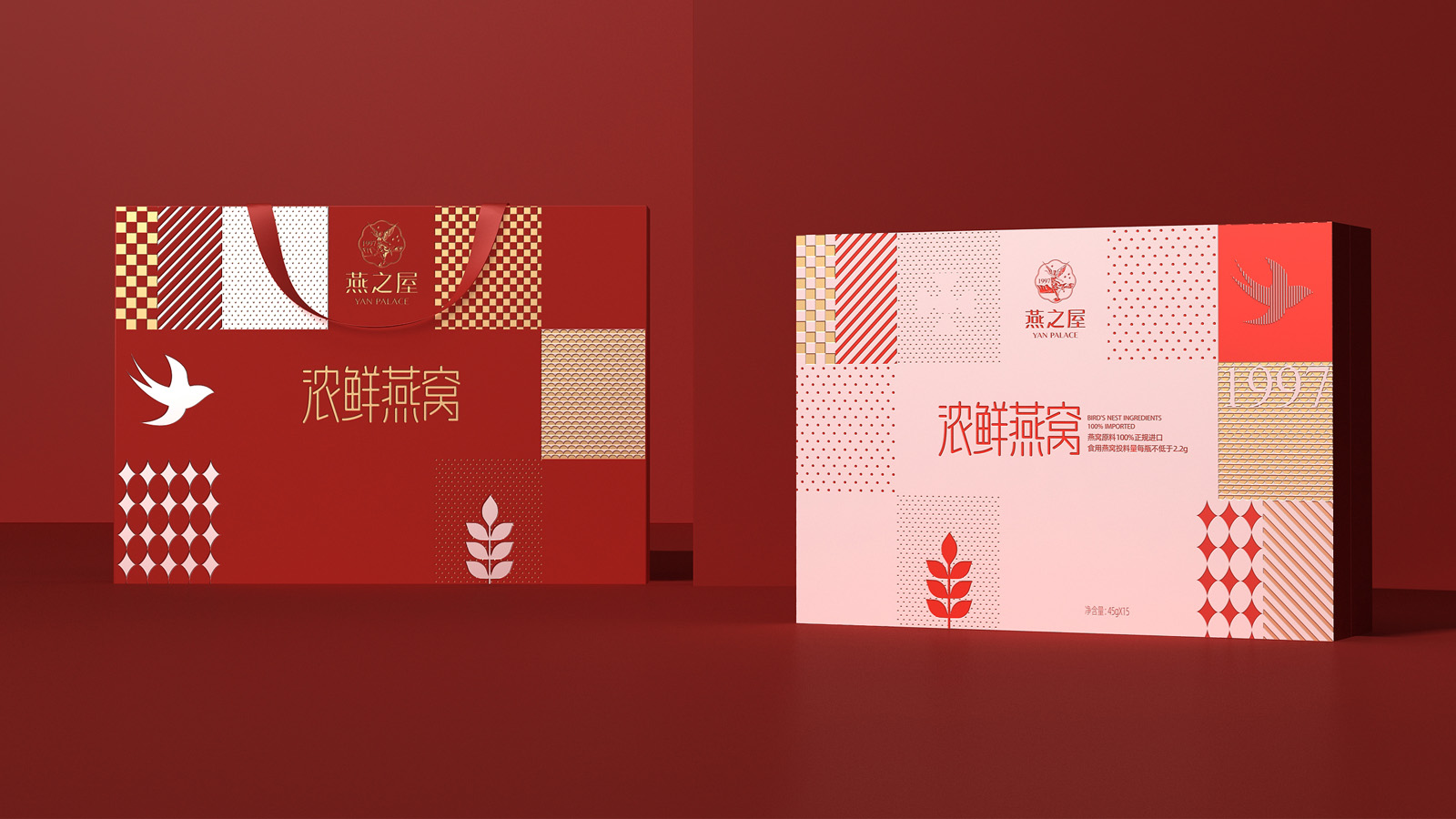 畫面的中的燕子代表著產品屬性,1997是燕之屋的成立時間,表達了燕之屋在燕窩領域行業已經深耕了23年,經典的波點,方格是對燕之屋的印象具象化表現,主要是為了烘托氛圍感,葉子代表著無添加,純天然,表達了燕之屋用心做產品的匠心精神。